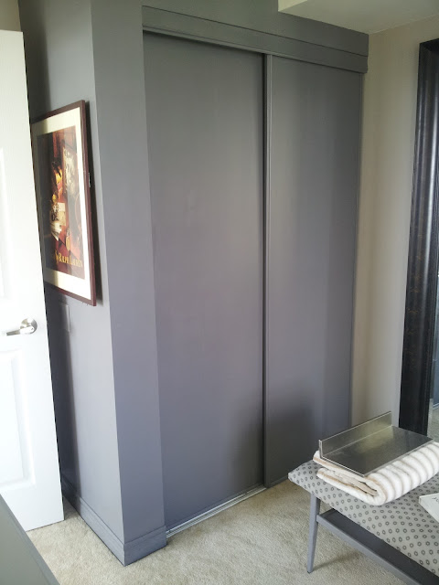 I know I said that this weekend I was going to take a load off, but I couldn't do it. I tried... I really tried, but while I was laying in bed Sunday morning I realized how boring my closet look.  The white, sliding door, builder basic closet. You know the ones. So, I decided to give it a bit of a makeover. Some paint, handles and a picture to hide the electrical box on the side.