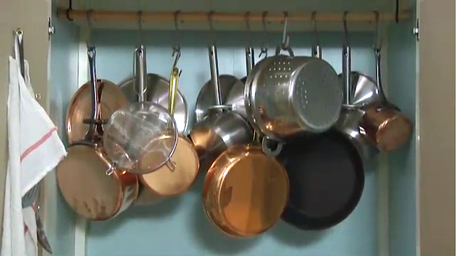 Adding cook books, spice jars, baskets and storage containers and the wardrobe is successfully fitted as a pantry. They also had space to store cutlery and plates in the two drawers. Watch the video on House and Home TV.