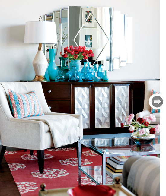 You can't tell from the picture but her coffee table is actually 6 feet long, and in a small space some might thing that this is way to large, but it works. She's added reflective surfaces, mirrors and the right amount a perfectly sized furniture to help make her space feel large and airy.