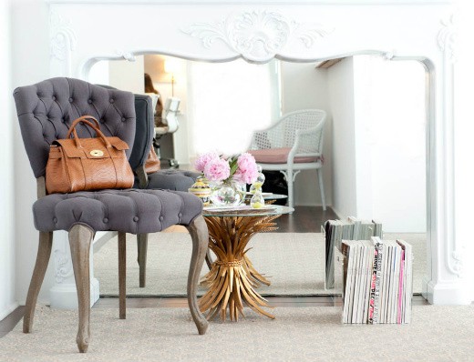 This tufted armless chair can be found a Home Sense. It has a super romantic look with it's rolled back and wood/brass wheeled legs. The black ribbon found between the seat and back can be used to accessorize the chair with a bow. Price: $199